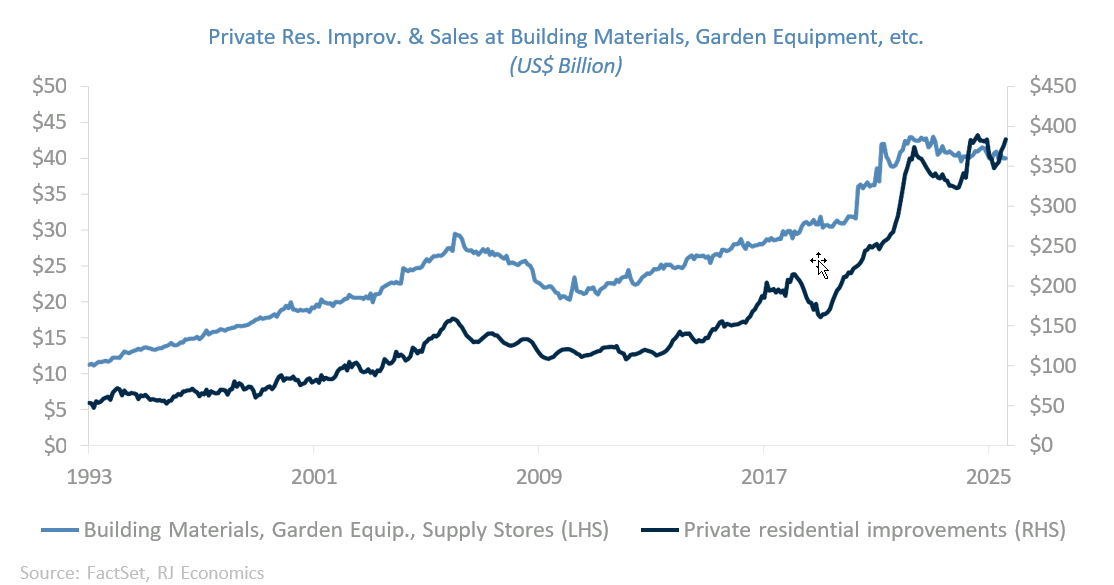 This private residential improvements component is different from the retail sector’s building materials and garden supply stores, which includes the do-it-yourself component for home renovations. The latter is part of consumption expenditures rather than the investment component of GDP, as is the case for the private residential improvement sector. However, the correlation between these two sectors (private residential improvements and building materials and garden supply) is about 95%.